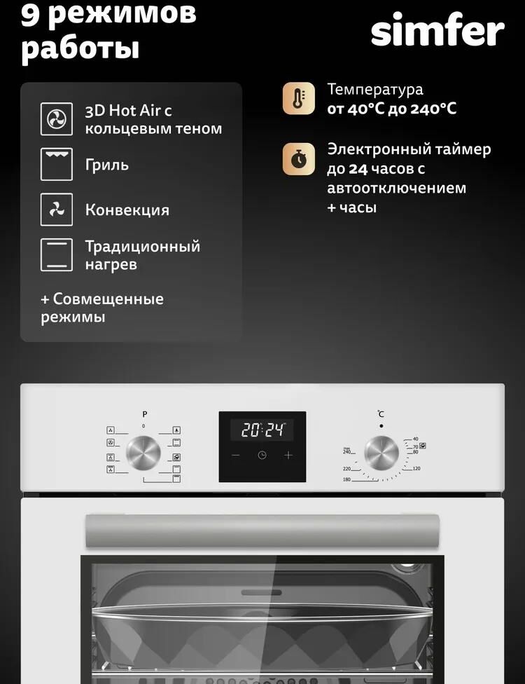 ВСТРАИВАЕМАЯ ЭЛЕКТРИЧЕСКАЯ ДУХОВКА • Класс энергоэффективности А • Мультифункциональная духовка • Количество режимов работы: 9 • Электрический термостат • Цифровой 3 кнопочный программатор с автоотключением,часы (белый) • Управление: утапливаемые переключ