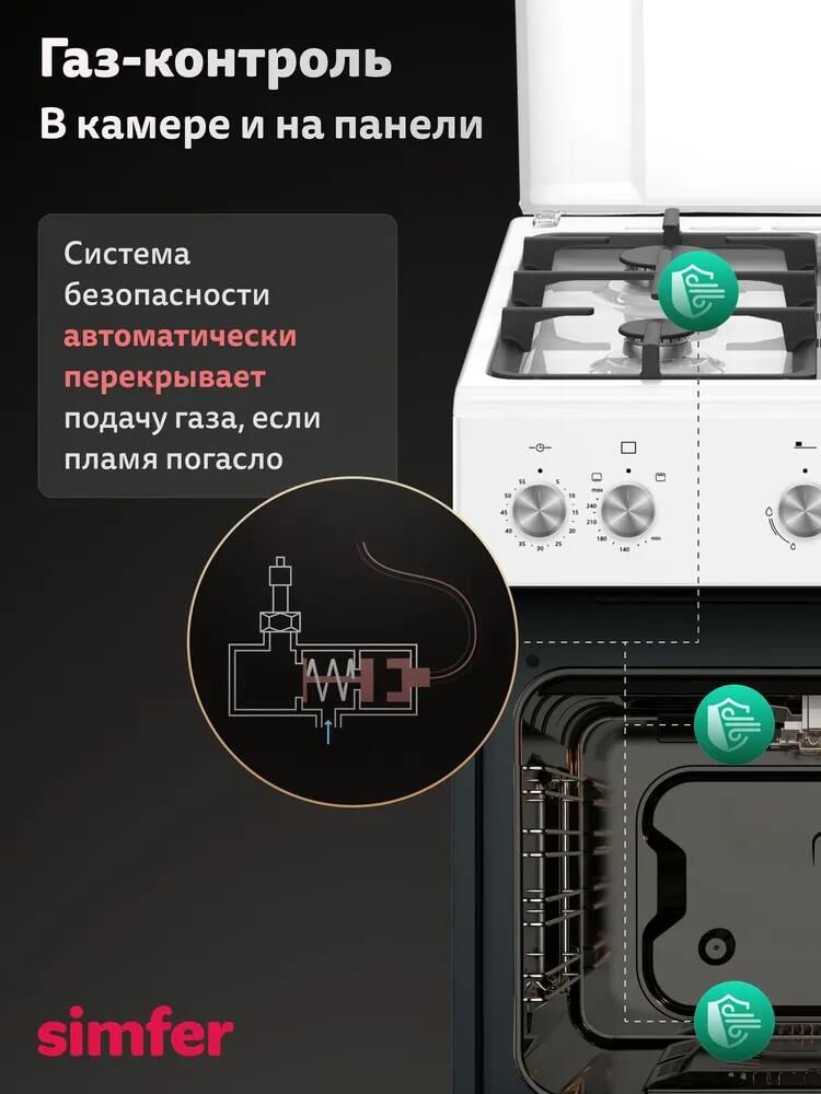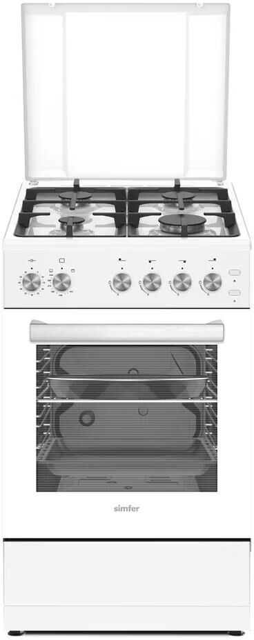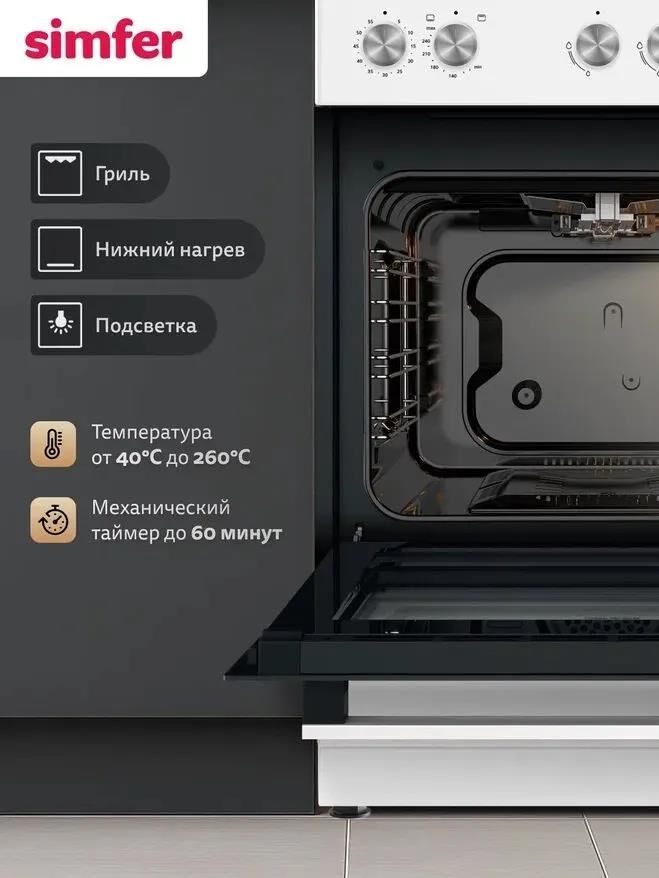 Независимая газовая соло плита 50х60 • Цвет: белая эмаль Поверхность: • Поверхность газовая: • Розжиг от кнопки • Газ-контроль • Чугунные решётки • Управление: поворотные переключатели • Металлическая крышка Духовой шкаф: • Газовая духовка • Газ-конт