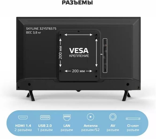 32" (81см) , Frameless, HD READY 1366×768, SMART TV Операционная система: YaOS Голосовое управление: Алиса 9.0 1RAM + 8Gb ROM. Системы цветности аналогового ТВSECAM / PAL Системы цветности для AVSECAM / PAL Цифровой тюнер DVB-T/T2да Функция SMARTда Декодеры стереозвукаA2 / NICAM Формат изображения16: 9 Разрешение экранаHD READY 1366×768 Динамический контраст70000: 1 Яркость230 Угол обзора (гор/верт)178/178 Цифровой 3D фильтрда Количество цветов16,7 млн. Время отклика8 мс Меню на русском, английском языкахда Телетекстда Звук мощность2×6 Вт Антенный входда Композитный AV вход / CVBS+ Audio R/Lда Аудио выход 3.5 ммда Аудио вход для ПКда HDMI3 x 1.4 Цифровой аудио выход / Digital Audio Outда USBUSB 2.0 x 2 SCARTда VGAда СI слотда Напряжение110-240V 50/60 Гц Макс. потребляемая мощность48 Вт Потребляемая мощность в режиме ожидания0.5 Вт Вес с подставкой3.5 кг Вес без подставки3.2 кг Размеры с подставкой732x479x191 мм. Размеры без подставки732x434x75 мм.