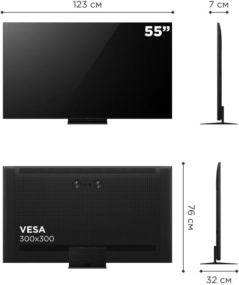 Тип Mini-LED Диагональ экрана 55" (140 см) Тип матрицы QLED Разрешение экрана 4K UHD Разрешение, пикс 3840×2160 Формат экрана 16:9 Технология затемнения Precise Dimming Частота обновления экрана 144 Гц Изображение Яркость 2600 кд/м2 Контрастность 6500:1 Угол обзора по горизонтали 178 ° Угол обзора по вертикали 178 ° Глубина цвета 23 бит Технология улучшения четкости AMD FreeSync Premium Pro Технология улучшения изображения CSOT HVA Система шумоподавления да Поддержка HDR да Формат HDR HDR10+, HDR10 Звук Общая выходная мощность 45 Вт Количество динамиков 4 Технология обработки звука Bang&Olufsen Поддержка DTS да Технология Dolby Atmos Технологии приема сигнала Аналоговый ТВ тюнер PAL, SECAM, NTSC Цифровой ТВ тюнер DVB-T2, DVB-S2, DVB-C, DVB-S, DVB-T Поддержка Smart TV Smart TV есть Операционная система Google TV Процессор TCL AiPQ Pro Интерфейсы Порт HDMI 4 Версия HDMI 2.1, 1.4, 2.0 Порт USB 3.0 1 Аудио оптический выход 1 Поддержка Ethernet да Слот для CI да Поддержка CI+ да Количество