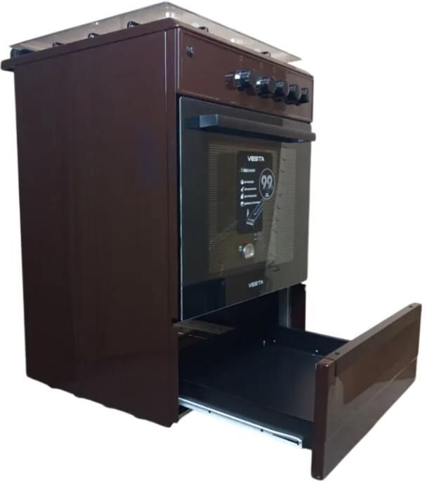 Горелки стола: Газовые – 4 шт. Ящик для посуды — выдвижной. Мощность горелок рабочего стола: Горелка передняя левая/правая – 2,0/2,4 кВт. Горелка задняя левая/правая – 2,0/1,0 кВт. -Мощность горелки духовки – 2,5 кВт. -Объем духовки в литрах: 65 л. Верхний/нижний нагреватель духовки – газ. Газ-контроль духовки. Решетка рабочего стола – сталь. Крышка рабочего стола – стекло. Термометр духовки. Кнопка электророзжига горелок стола. В/Ш/Г 850/600/600