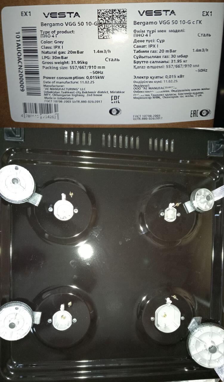 Горелки стола: Газовые – 4 шт. Газ.Контроль — рабочего стола. Мощность горелок рабочего стола: Горелка передняя левая/правая – 2,0/2,4 кВт. Горелка задняя левая/правая – 2,0/1,0 кВт. Электрический духовой шкаф. Объем духовки в литрах: 65 л. Верхний/нижний нагреватель духовки – тен.Решетка рабочего стола – сталь. Крышка рабочего стола – стекло. Термометр духовки. Кнопка электророзжига горелок стола. Электрическая подсветка духовки. Противень – 2 шт. В/Ш/Г 850/500/570