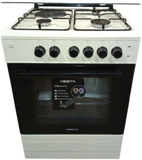 Ширина плиты, см 60, Глубина плиты, см 60, Объем духовки, л 65, Высота, см 85, Горелки стола: Газовые – 3 шт. Электр.–1 шт. Мощность горелок рабочего стола: -Горелка передняя левая/правая – 2,0/2,4 кВт. Горелка задняя левая, электрическая – 1,5 кВт. Горелка задняя правая – 1,0 кВт. Решетка рабочего стола – сталь. Крышка рабочего стола – стекло. Верхний нагреватель духовки – ТЭН. Нижний нагреватель духовки – ТЭН. Электророзжиг при помощи кнопки. Электрическая подсветка духовки. Термостат, Индикатор работы электроконфорок. Индикатор работы ТЭНа духовки. Противень – 2 шт.