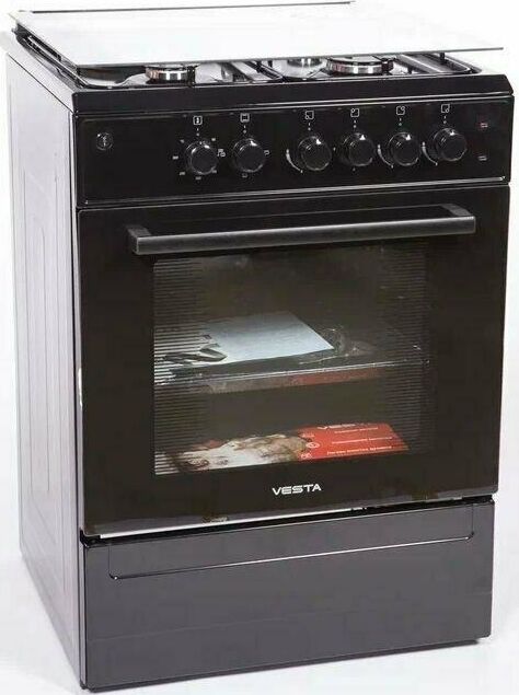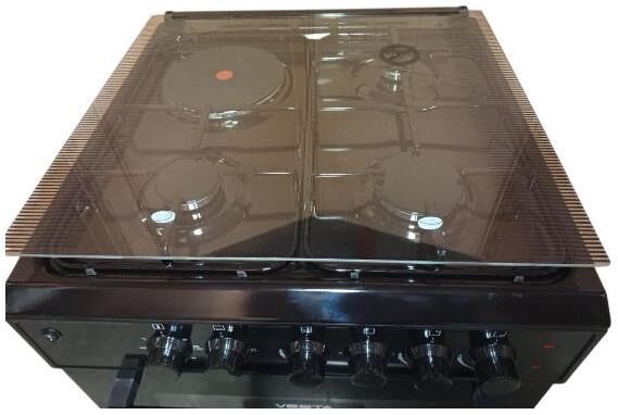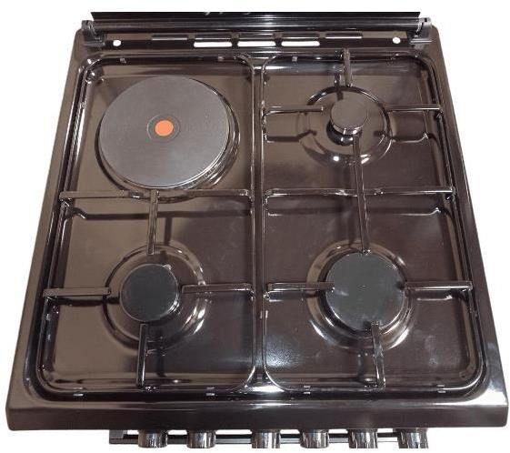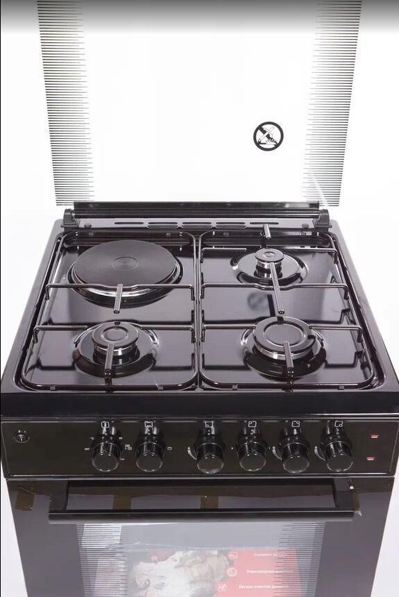 Габариты и вес: Ширина плиты, см 50, Глубина плиты, см 57, Высота, см 85, Вес кг 35. Горелки стола: Газовые – 3 шт. Электр.–1 шт. Мощность горелок рабочего стола: -Горелка передняя левая/правая – 2,0/2,4 кВт. Горелка задняя левая, электрическая – 1,5 кВт. Горелка задняя правая – 1,0 кВт. Решетка рабочего стола – сталь. Крышка рабочего стола – стекло. Верхний нагреватель духовки – ТЭН. Нижний нагреватель духовки – ТЭН. Электророзжиг при помощи кнопки. Электрическая подсветка духовки. Термостат, Индикатор работы электроконфорок. Индикатор работы ТЭНа духовки. Противень – 2 шт. Цвет Черный.
