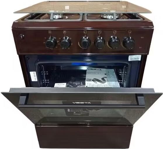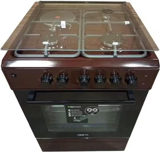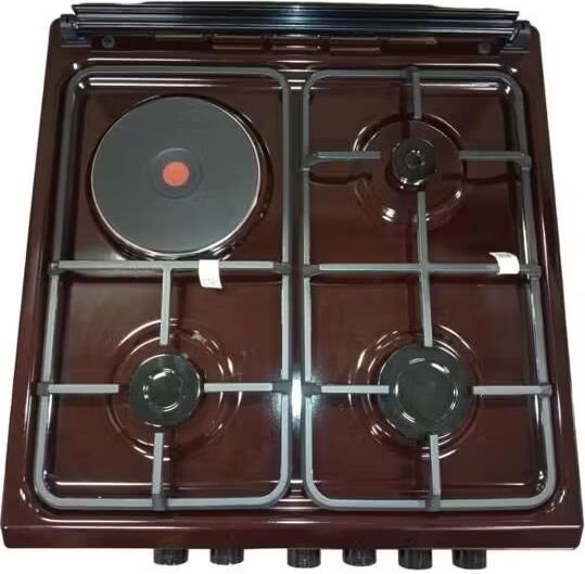 Габаритные размеры (В*Ш*Г) 85*60*60 см. Цвет коричневый. ; Решетка чугунная. ; Объем духовки 65 л. ; Тип духовки электрический. ; Электроподжиг конфорок механический. ; Режимы работы духовки 6. Конвекция. ; Тип очистки традиционный. ; Термостат духовки. ; Стекло дверцы духовки 2-слойное.