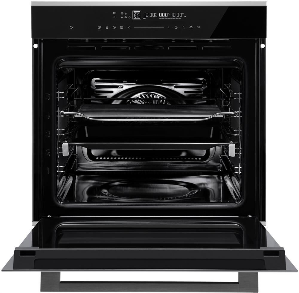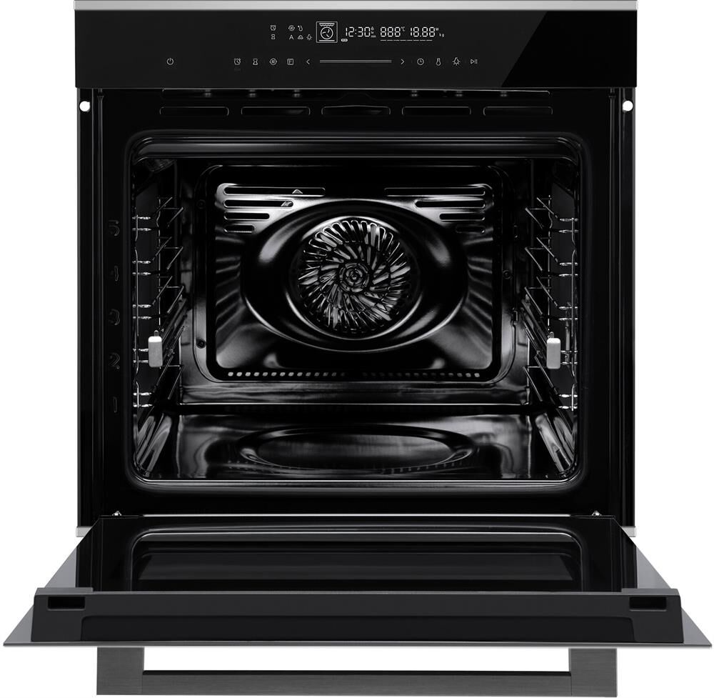 Тип духовки: электрическая. Тип управления: независимое. Переключатели: сенсорные. Мощность подключения: 2900. Объем духовки: 72. Максимальная температура: 250. Класс энергоэффективности: A+. Очистка духовки: традиционная. Материал внутреннего покрытия духовки: эмаль легкой очистки. Вид таймера: электронный. Тип гриля: электрический. Количество стекол в дверце: 3. Освещение духовки: есть. Тип освещения: галогенное. Мощность ламп подсветки: 25. Многофункциональная духовка: да. Количество программ духовки: 13. Открывание дверцы: вниз. Тип телескопических направляющих: 1-уровневые. Габариты упаковки (ед) ДхШхВ: 0.721×0.64×0.66. Вес упаковки (ед): 39.8. Гарантия: 12 мес.. Размеры ниши для встраивания (ШхГхВ): 56 x 55 x 60 см. Размеры (ШхГхВ): 59.5 х 56.6 х 59.6 см. Цвет: черный/нержавеющая сталь. Функции: автоматический быстрый разогрев, отсрочка старта, таймер, часы. Индикация: времени приготовления, звуковая индикация, режима работы. Особенности конструкции: дисплей, телескопические направляющие, электронный пр