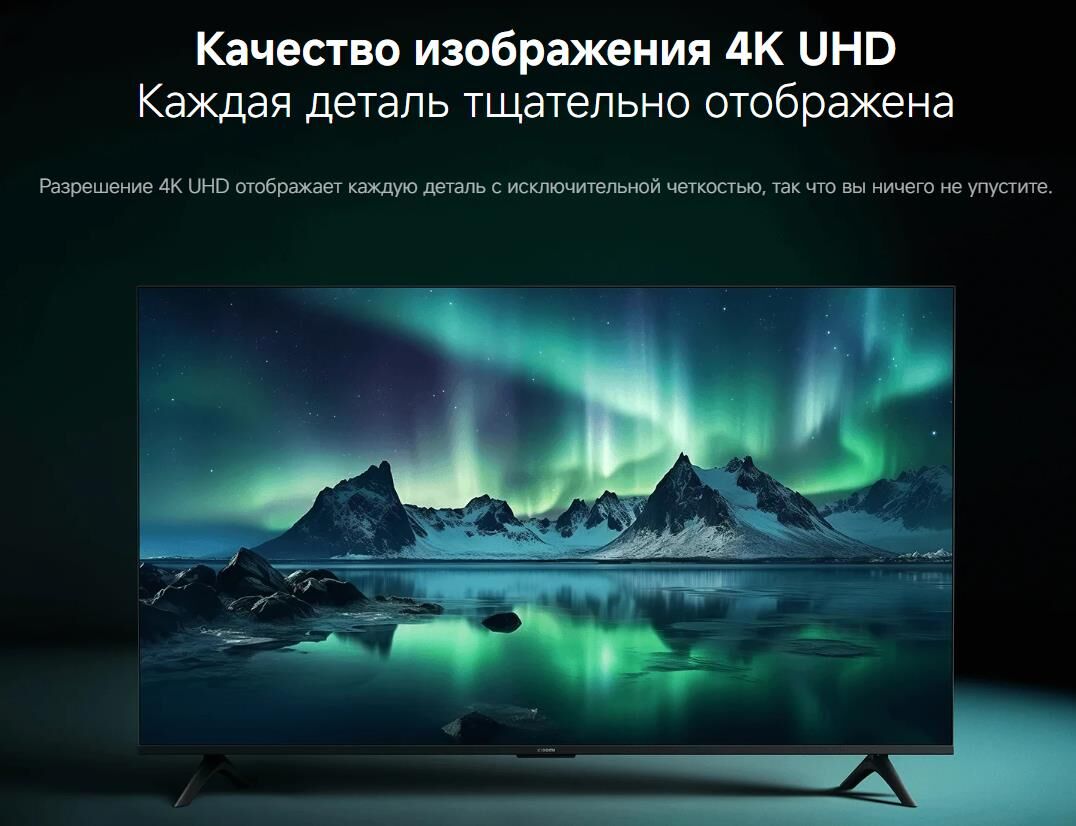 • Разрешение: 3840 x 2160 • Частота обновления: 60Hz • Глубина цвета: 1.07 миллиарда • Углы обзора: 178°(Г)/ 178°(В) Аудио • Два динамика по 10 W каждый • Dolby Audio, DTS-X, DTS Virtual:X Процессор • ЦПУ: Quad Cortex-A55 • ГПУ: Mali G52 MC1 • ОЗУ: 2 Гб • Хранилище: 8 Гб Дизайн и размеры • Премиальный безрамочный дизайн • Две ножки • Размеры (без подставки): 957 x 72 x 563мм • Размеры (с подставкой): 957 x 211 x 599мм • Настенное крепление: 100 х 200мм Система • Android U • Встроенный Google Assistant built-in • Работает с Google Cast и Miracast • Поддержка режима Filmmaker Подключение • Wi-Fi 2.4GHz/5GHz • Bluetooth 5.0 • Система вещания: DVB-T2/C,DVB-S2 • Порты: — HDMI x 3 — USB 2.0 x 1 — Ethernet (LAN) x 1 — Композитный вход (AV) — Оптический x 1