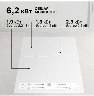 Стеклокерамическая варочная панель (индукция). 3 конфорки. Управление мультислайдер. Общая мощность: 6200 Вт. Бустер на каждую зону нагрева. Инвертор. Индикация остаточного тепла. Блокировка клавиатуры. Защита от перегрева. Автоотключение при длительном использовании. Автоматическое определение размера посуды и регулировка мощности. Таймер на каждую зону. Габариты (ШхГхВ): 450*520*56 мм. Ниша для встраивания (ШхГхВ): 430*495 мм. Длина шнура питания 880 мм. Цвет: Белый